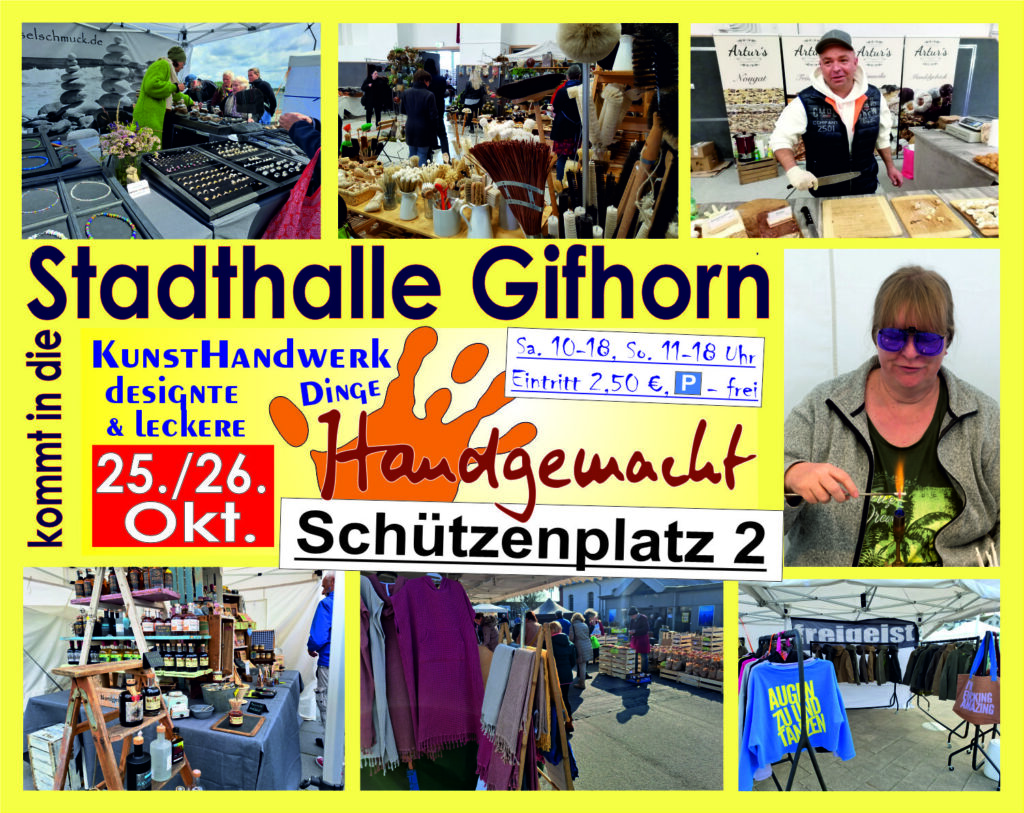 Wir freuen uns auf die Gifhorner Stadthalle am 25. und 26. Oktober. Über 40 Aussteller sind noch einmal mit dabei, Kunsthandwerker und Anbieter schöner wie auch leckerer Dinge. Der Markt hat geöffnet am Samstag von 10-18, am Sonntag von 11-18 Uhr. Der Eintritt für die Besucher beträgt wie all die Jahre schon nur 2,50 €, das Parken auf dem anliegenden Großparkplatz “Schützenplatz” ist kostenfrei möglich. Kommt einfach einmal vorbei, wir freuen uns auf Euch…