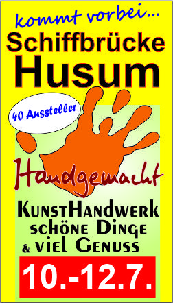 Im unteren Bereich der Husumer Fußgängerzone direkt an der Hafenkante liegt die schöne Eventfläche “Schiffbrücke”. Hier spielt sich gerade in der Hauptsaison das touristische Leben der Region ab. Wie immer, werden wir auch diesen Markt riesig in ganz Nordfriesland bewerben, so das wir von einer sehr gut besuchten Veranstaltung ausgehen werden. Platz haben wir für 40 Kunsthandwerker und Anbieter schöner und leckerer Dinge. Unsere kleine Maktgastronomie lädt zum Verweilen ein.